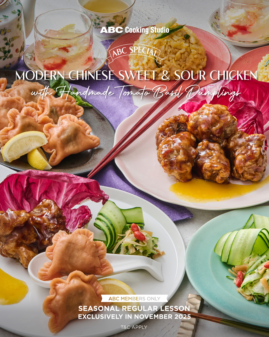 Find the learnings of modern Chinese cuisine in Modern Chinese Sweet & Sour Chicken with Handmade Tomato Basil Dumplings where you could be making up to five dishes from appetizer to desserts, all within one session!